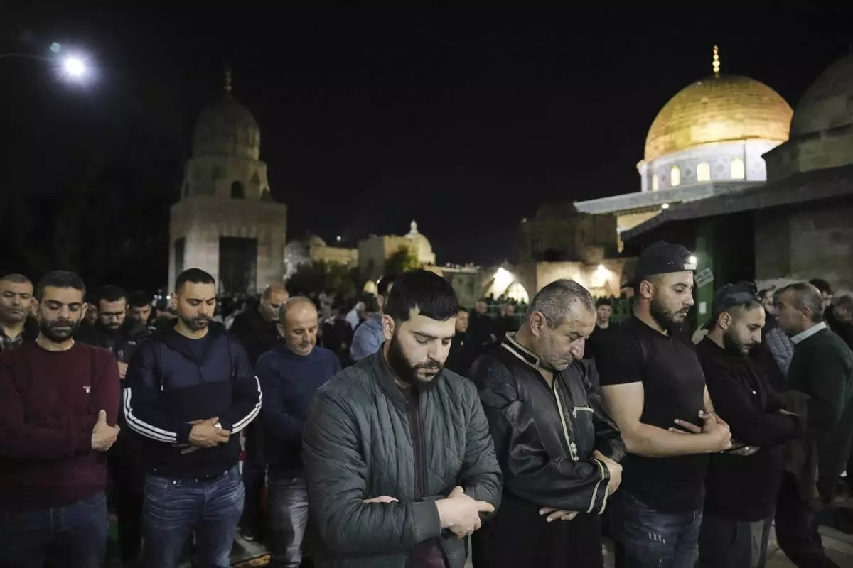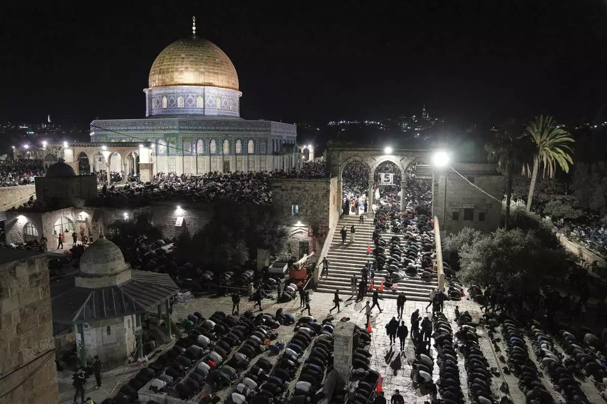 Palestinian Muslim worshippers pray during Laylat Al Qadr, also known as the Night of Power and marked on the 27th day of the holy fasting month of Ramadan, in front of the Dome of the Rock shrine at the Al-Aqsa Mosque compound in the Old City of Jerusalem, Wednesday, March 26, 2025. (AP Photo/Mahmoud Illean)