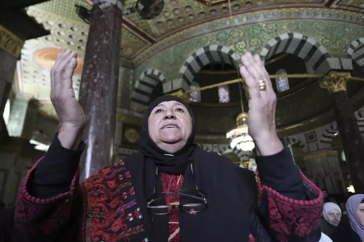 A woman prays at the Al-Aqsa Mosque compound during the first Friday Prayers of the Muslim holy month of Ramadan in the Old City of Jerusalem, Friday, March 7, 2025. (AP Photo/Mahmoud Illean)