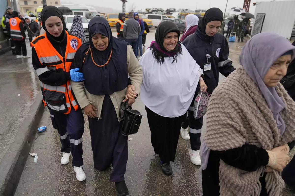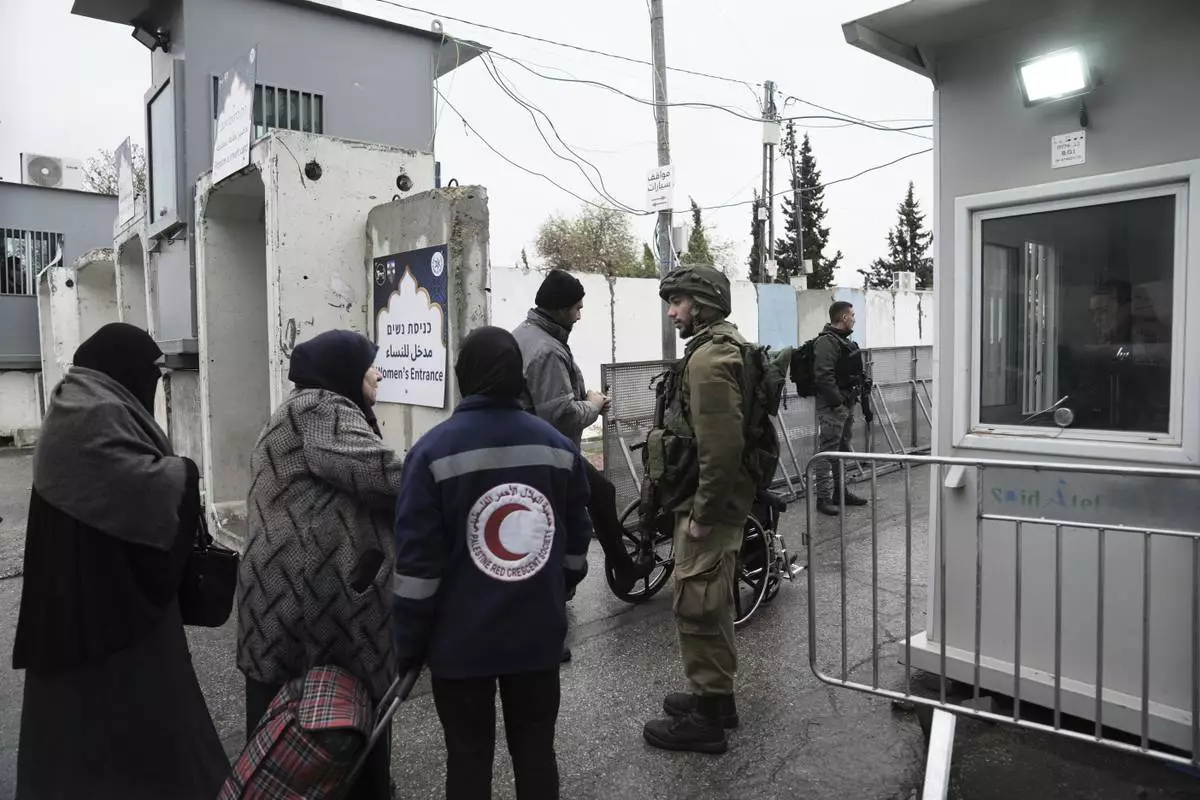 Volunteer paramedics help elderly Palestinian women while they try to crosses from the Israeli military Qalandia checkpoint near the West Bank city of Ramallah to Jerusalem, to participate in the Friday prayers at the Al-Aqsa Mosque compound during the Muslim holy month of Ramadan on Friday, March 21, 2025. (AP Photo/Nasser Nasser)