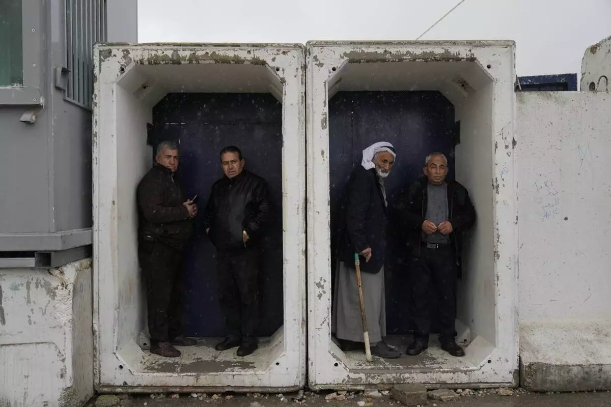 Palestinians take cover from the rain while they wait to cross from the Israeli military Qalandia checkpoint near the West Bank city of Ramallah to Jerusalem, to participate in the Friday prayers at the Al-Aqsa Mosque compound during the Muslim holy month of Ramadan on Friday, March 21, 2025. (AP Photo/Nasser Nasser)