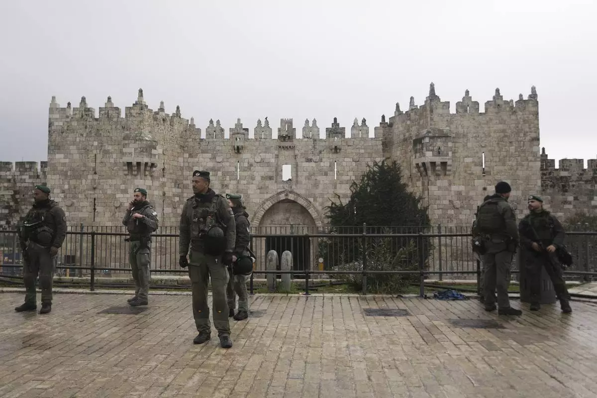 Israeli Border Police stand guard at the Damascus Gate to the Old City of Jerusalem as worshippers make their way to the Al-Aqsa Mosque compound for the first Friday Prayers of the Muslim holy month of Ramadan, Friday, March 7, 2025. (AP Photo/Mahmoud Illean)