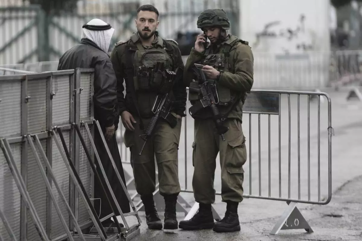 Israeli soldiers check a Palestinian man's ID at a checkpoint in the West Bank city of Bethlehem, on his way to the Al-Aqsa Mosque compound in Jerusalem for the first Friday Prayers of the Muslim holy month of Ramadan, Friday, March 7, 2025. (AP Photo/Mahmoud Illean)