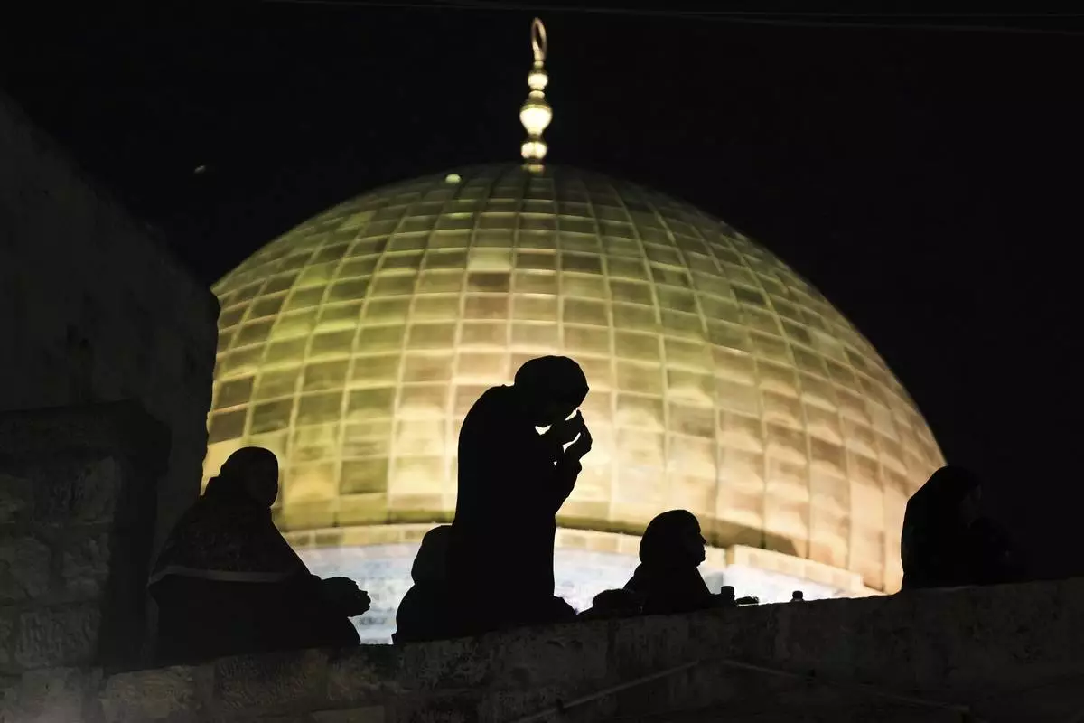 Palestinian Muslim women pray during Laylat Al Qadr, also known as the Night of Power and marked on the 27th day of the holy fasting month of Ramadan, in front of the Dome of the Rock shrine at the Al-Aqsa Mosque compound in the Old City of Jerusalem, Wednesday, March 26, 2025. (AP Photo/Mahmoud Illean)