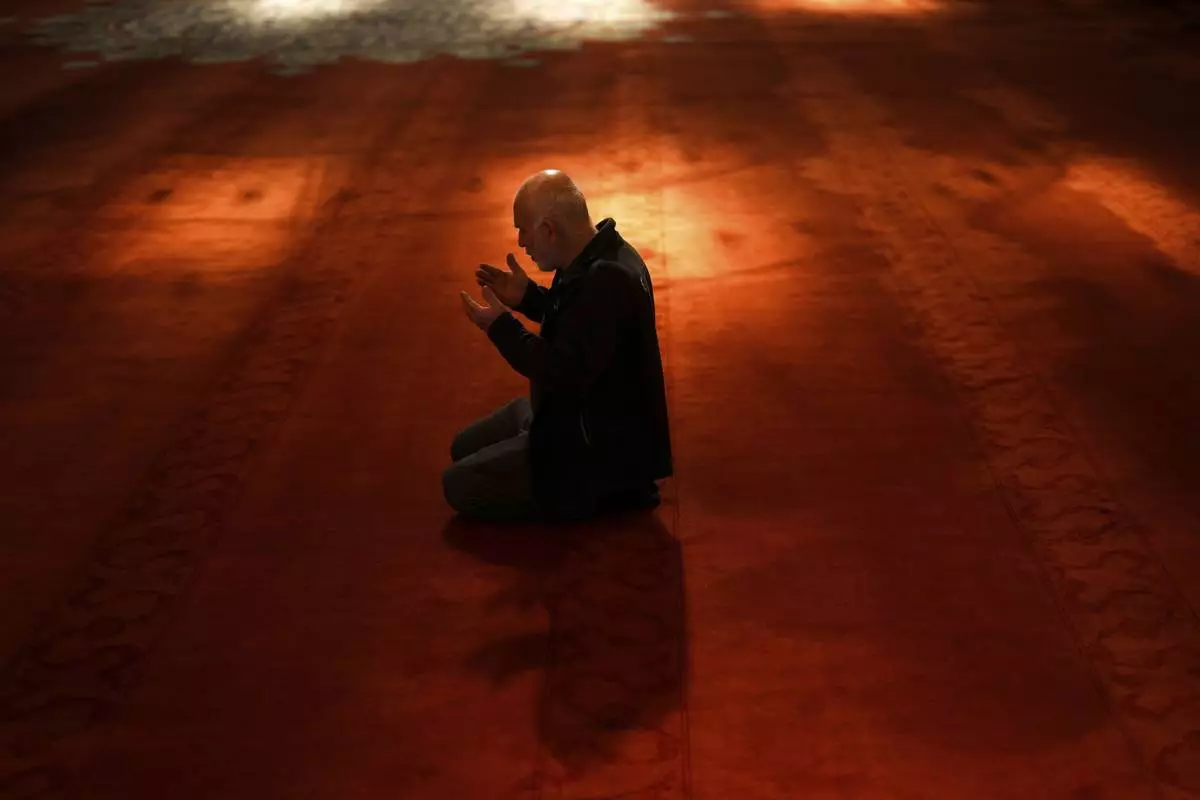 A Muslim worshipper prays on the first day of the Muslim holy month of Ramadan at Yeni mosque in Istanbul, Turkey, Saturday, March 1, 2025. (AP Photo/Francisco Seco)