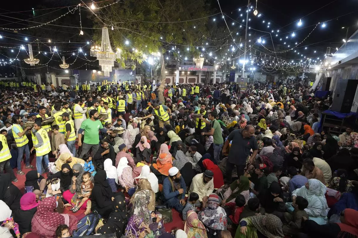Families eat pre-dawn meal or 'Sehri' to start their fasting during the Muslim's holy fasting month of Ramadan, at a free meal distribution center run by a charity group, in Karachi, Pakistan Sunday, March 2, 2025. (AP Photo/Fareed Khan)