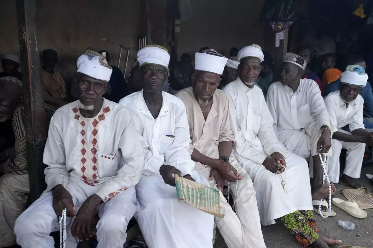 Less privileged men raise waits to collect ramadan cook jollof rice and Chicken in Lagos, Nigeria, Tuesday, March 11, 2025. (AP Photo/Sunday Alamba)
