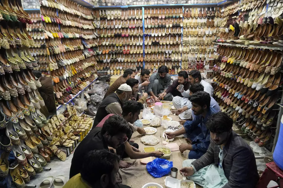 Shopkeepers break their fast during the holy fasting month of Ramadan, at a shop in Lahore, Pakistan, Monday, March 10, 2025. (AP Photo/K.M Chaudary)