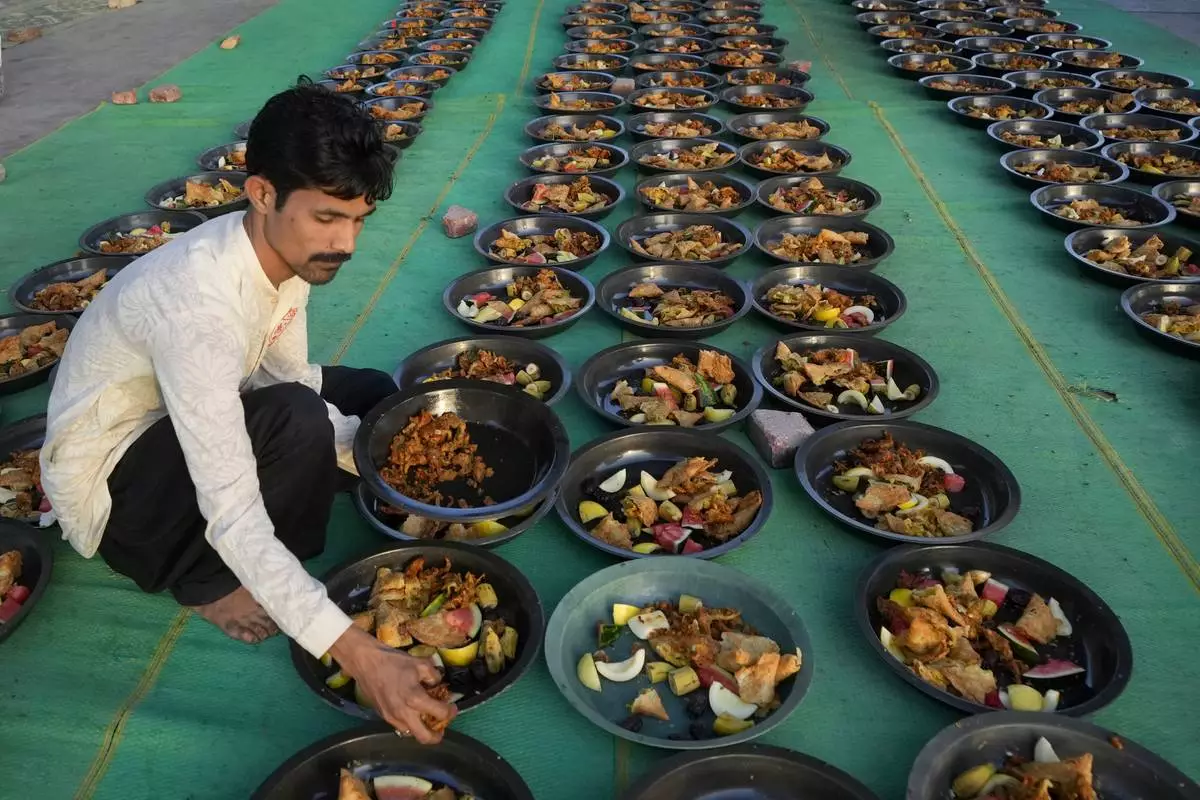 A volunteer prepares food plates to be distributed among people for breaking their fast at a free meal distribution point during the Muslim's holy fasting month of Ramadan, in Karachi, Pakistan, Monday, March 3, 2025. (AP Photo/Fareed Khan)