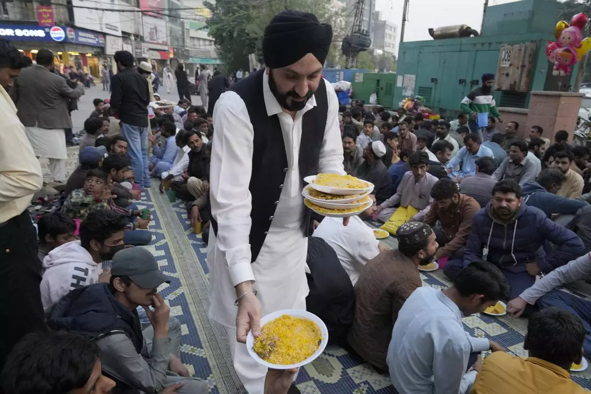 A Sikh volunteer distributes food plates among people for breaking their fast during the holy fasting month of Ramadan, at a free meal point, in Lahore, Pakistan, Monday, March 10, 2025. (AP Photo/K.M Chaudary)