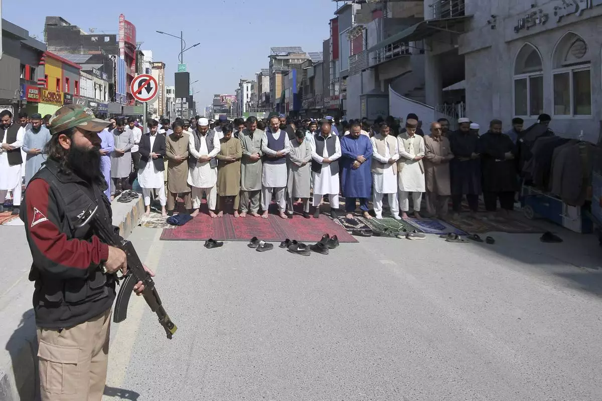 A police officer stands guard as Muslims attend first Friday prayers during the Muslim holy fasting month of Ramadan, at the outer area of a mosque, in Peshawar, Pakistan, Friday, March 7, 2025. (AP Photo/Muhammad Sajjad)