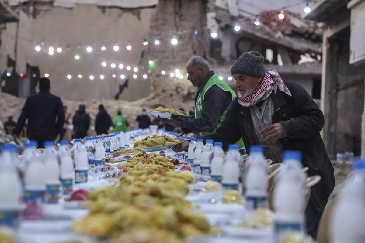 A table is prepared for iftar, the fast-breaking meal, organized by the Turkish Humanitarian Relief Foundation (IHH), on the first day of Ramadan in the Jobar neighborhood, which was devastated by the Syrian war, in Damascus, Syria, on Saturday, March 1, 2025.(AP Photo/Ghaith Alsayed)