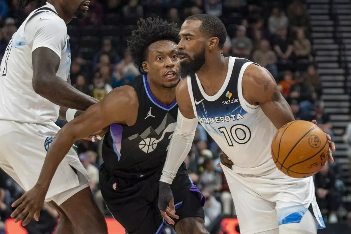 Minnesota Timberwolves guard Mike Conley (10) takes the ball inside as Utah Jazz guard Collin Sexton, left, defends during the first half of an NBA basketball game Friday, Feb. 28, 2025, in Salt Lake City. (AP Photo/Rick Egan)