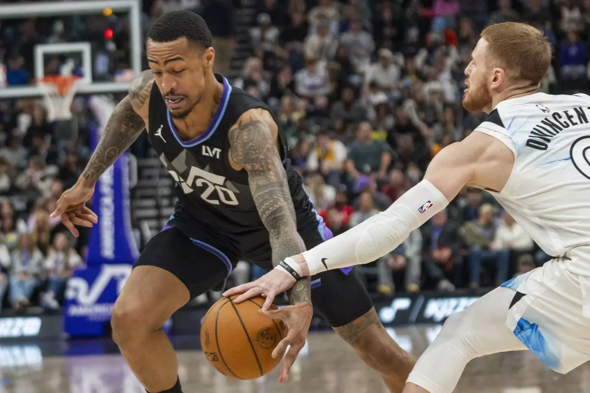 Utah Jazz forward John Collins (20) takes the ball inside as Minnesota Timberwolves guard Donte DiVincenzo, right, defends during the first half of an NBA basketball game Friday, Feb. 28, 2025, in Salt Lake City. (AP Photo/Rick Egan)