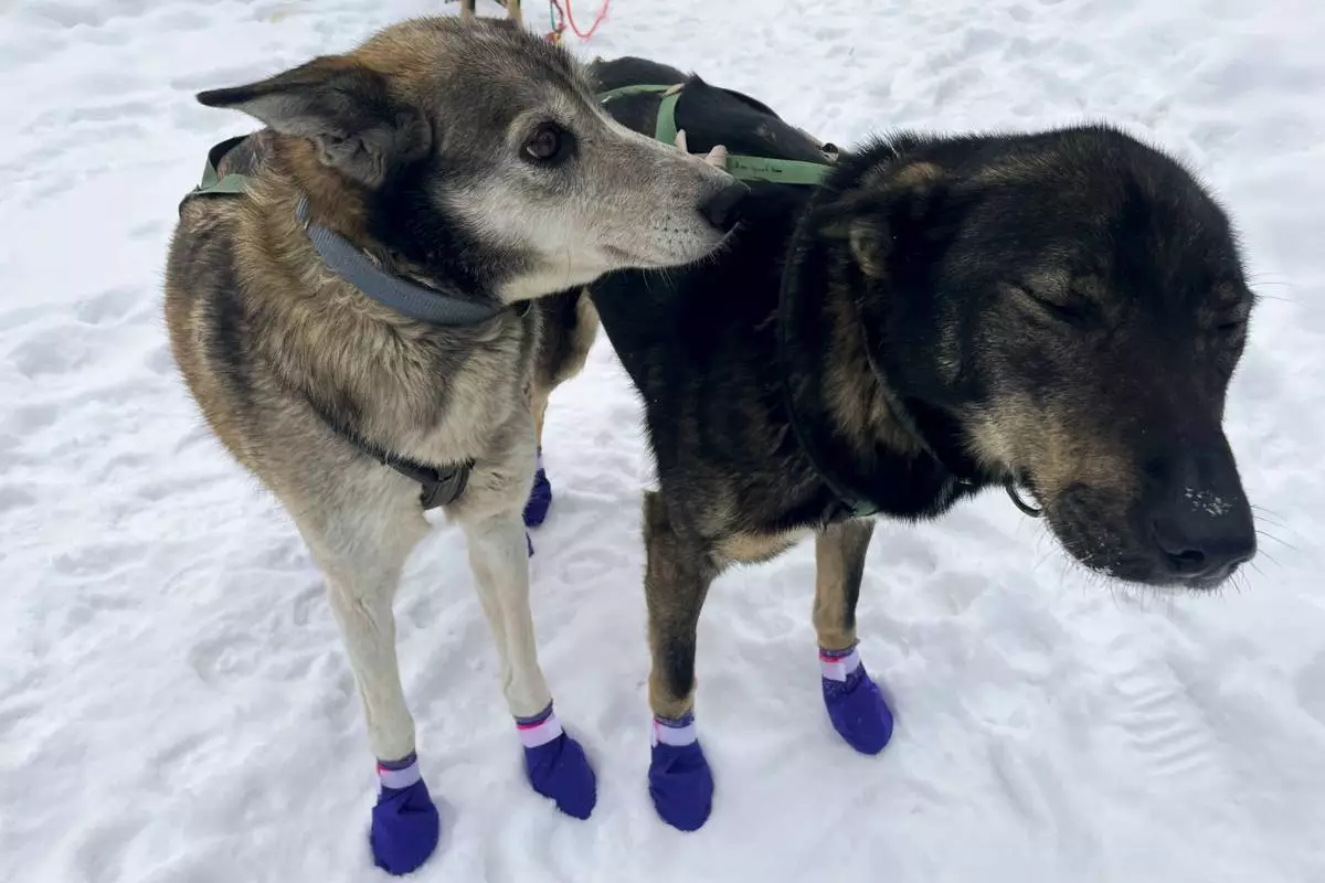 FILE - Ghost, left, and Sven, two leaders on the team of Ryan Redington, the 2023 Iditarod Trail Sled Dog champion, stand ahead of a training run, Feb. 26, 2024, in Knik, Alaska. (AP Photo/Mark Thiessen, File)