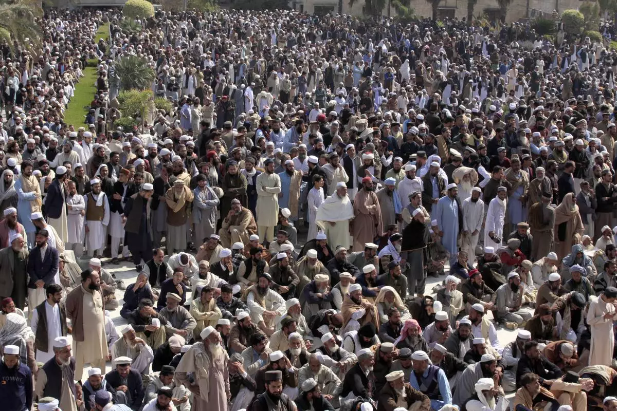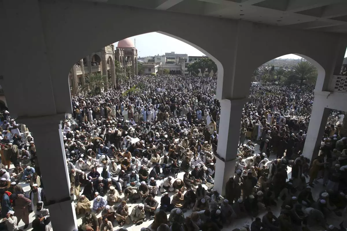 Mourners attend the funeral prayer of a senior Muslim cleric, Hamidul Haq who was killed in the Friday's suicide bomb attack at a pro-Taliban seminary in Akora Khattak, Pakistan, Saturday, March 1, 2025. (AP Photo/Muhammad Sajjad)