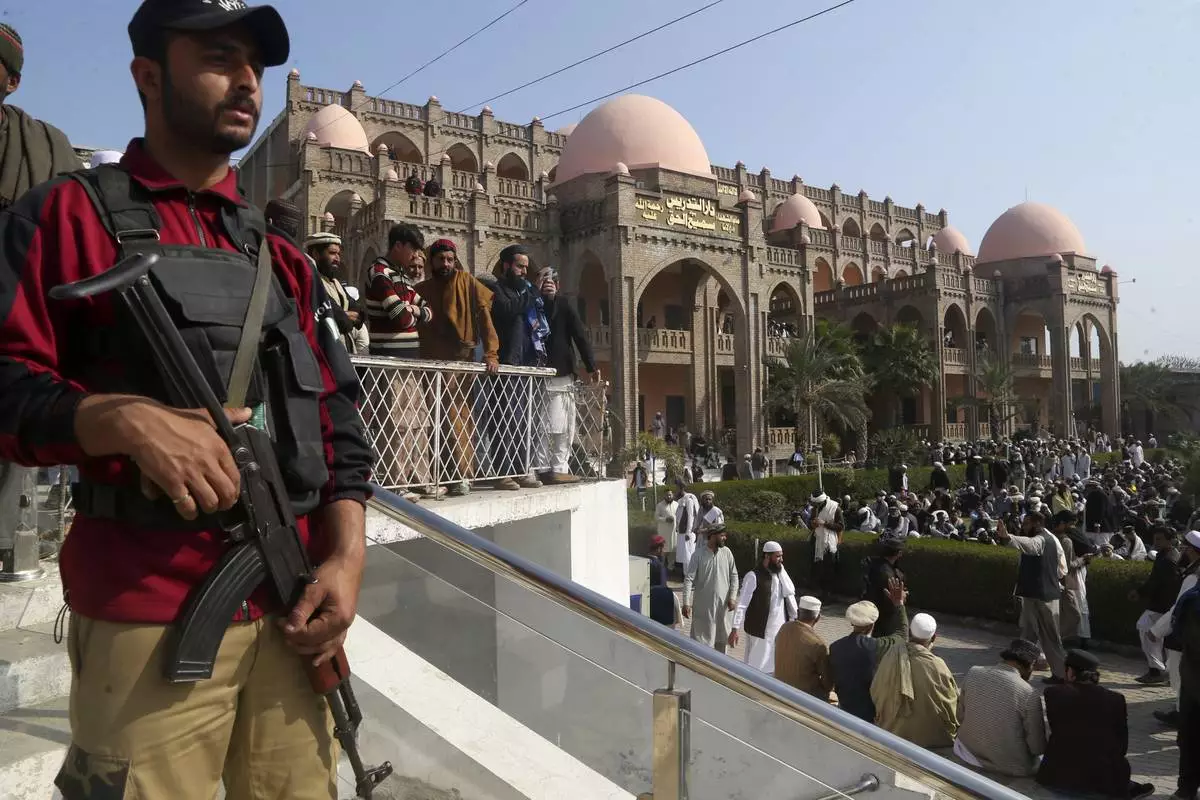 A police officer stands guard as mourners arrive to attend the funeral prayer of a senior Muslim cleric, Hamidul Haq who was killed in the Friday's suicide bomb attack, at a pro-Taliban seminary in Akora Khattak, Pakistan, Saturday, March 1, 2025. (AP Photo/Muhammad Sajjad)