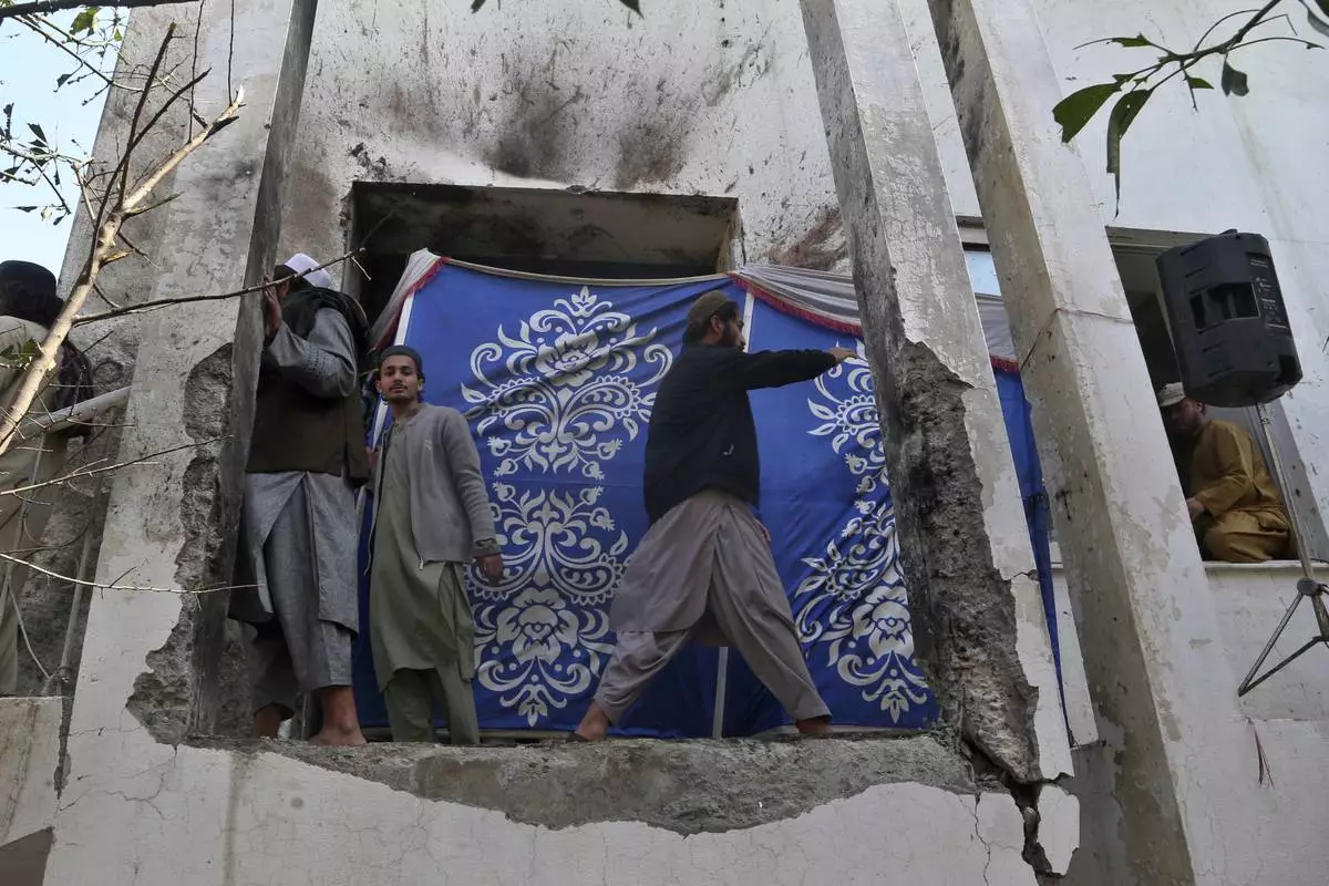 Mourners look at the site of Friday's suicide bombing following the funeral prayer of a senior Muslim cleric, Hamidul Haq, at a pro-Taliban seminary in Akora Khattak, Pakistan, Saturday, March 1, 2025. (AP Photo/Muhammad Sajjad)