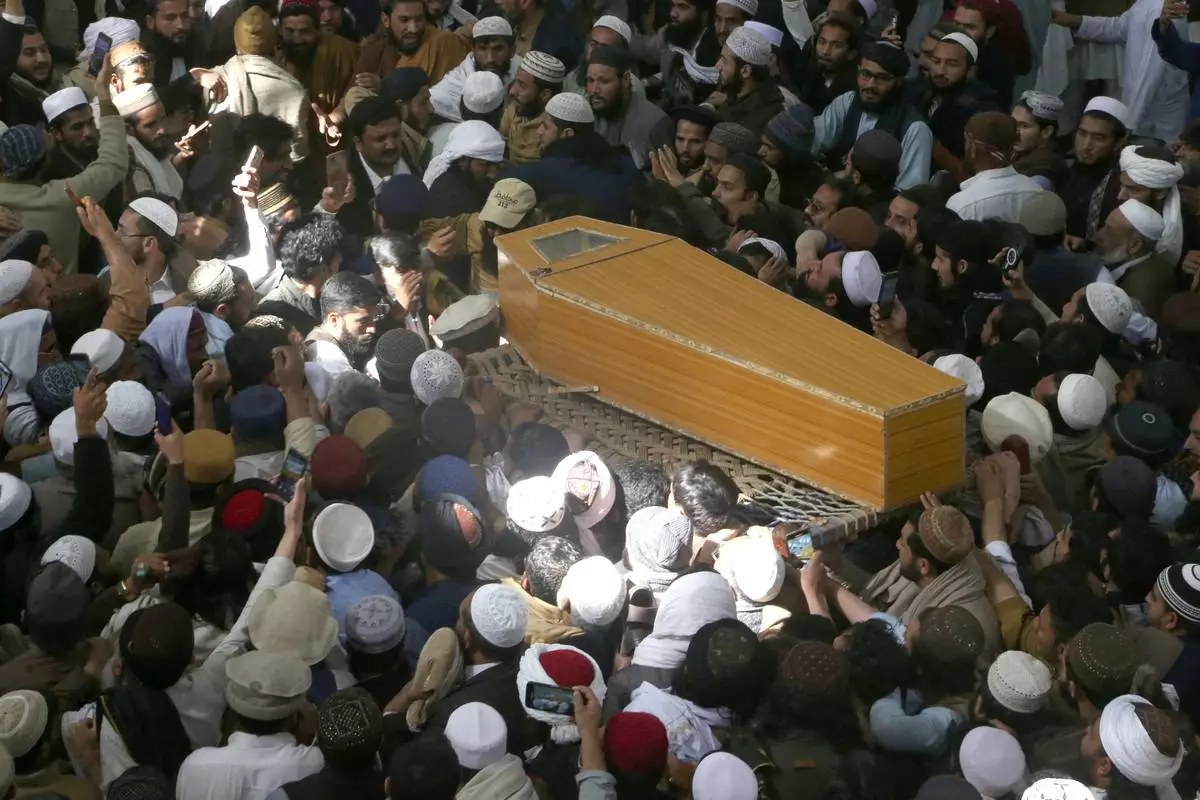 AKORA KHATTAK, Pakistan (AP) — Thousands of mourners attended a funeral on Saturday for a Taliban-linked cleric slain in a suicide bomb attack on a seminary in Pakistan’s northwest.