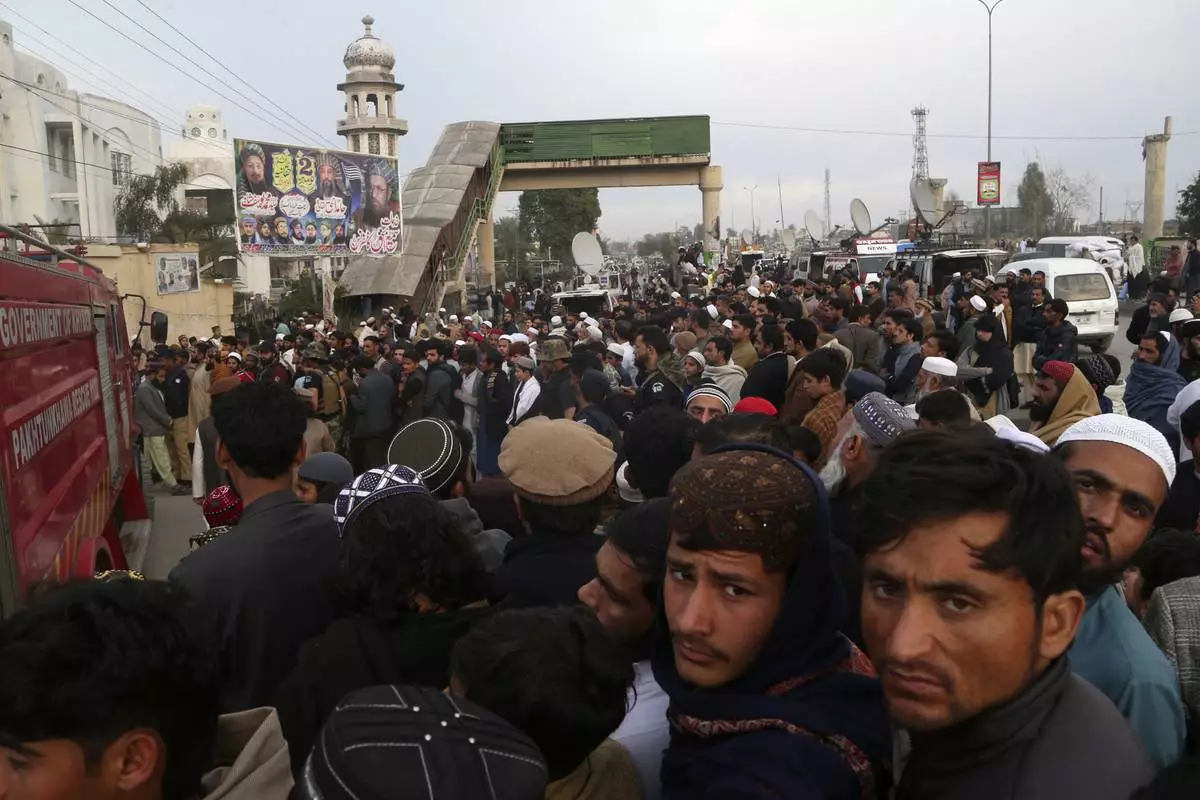 Police officers control crowd gather outside a pro-Taliban seminary 'Darul Uloom Haqqania' following a suicide bombing in a mosque, in Akora Khattak, a district in the Pakistan's northwestern Khyber Pakhtunkhwa province, Friday, Feb. 28, 2025. (AP Photo/Muhammad Sajjad)