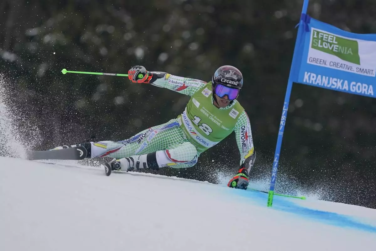 Andorra's Joan Verdu competes in an alpine ski, men's World Cup giant slalom, in Kranjska Gora, Slovenia, Saturday, March 1, 2025. (AP Photo/Pier Marco Tacca)