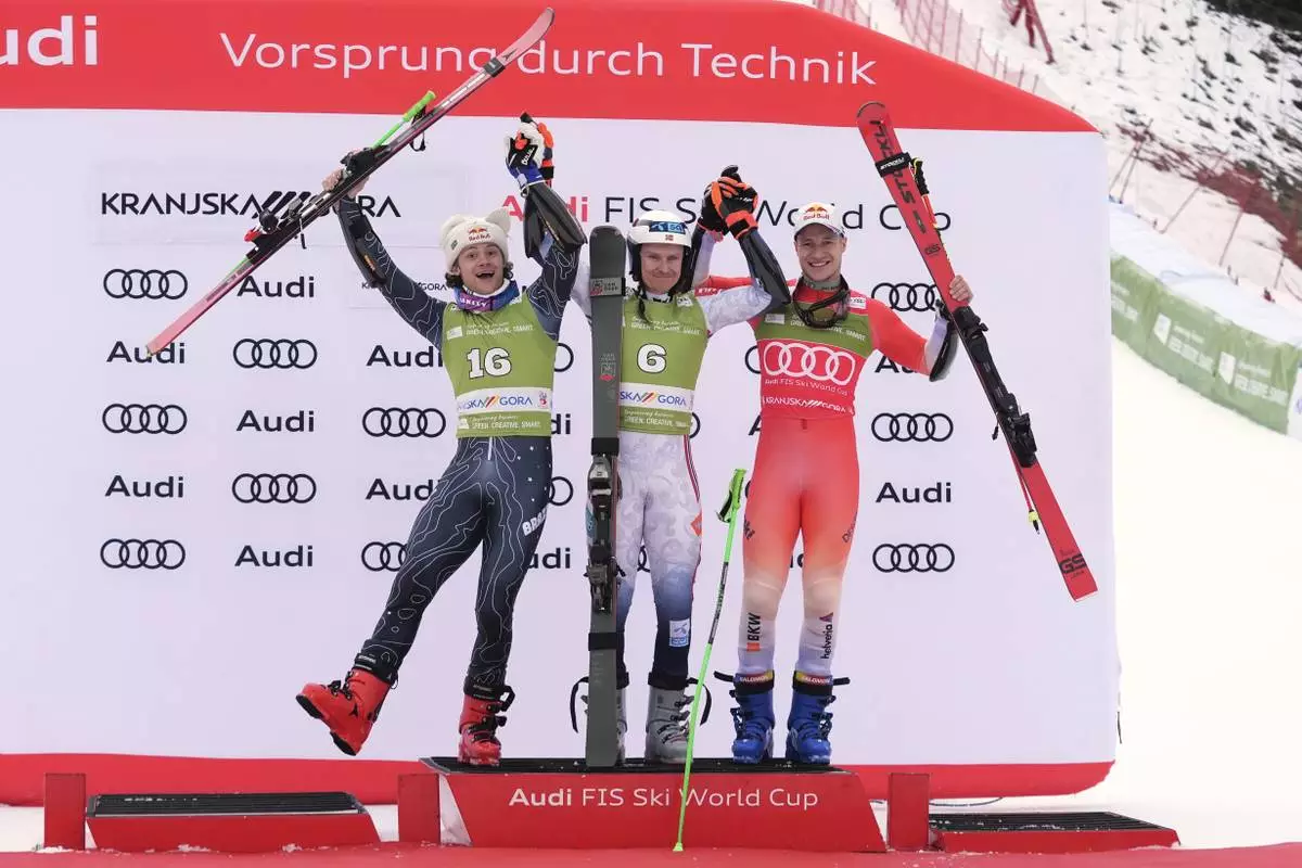 Norway's Henrik Kristoffersen, center ,winner of an alpine ski, men's World Cup giant slalom, celebrates on the podium with second-placed Brazil's Lucas Pinheiro Braathen, left, and third-placed Switzerland's Marco Odermatt, in Kranjska Gora, Slovenia, Saturday, March 1, 2025. (AP Photo/Giovanni Auletta)