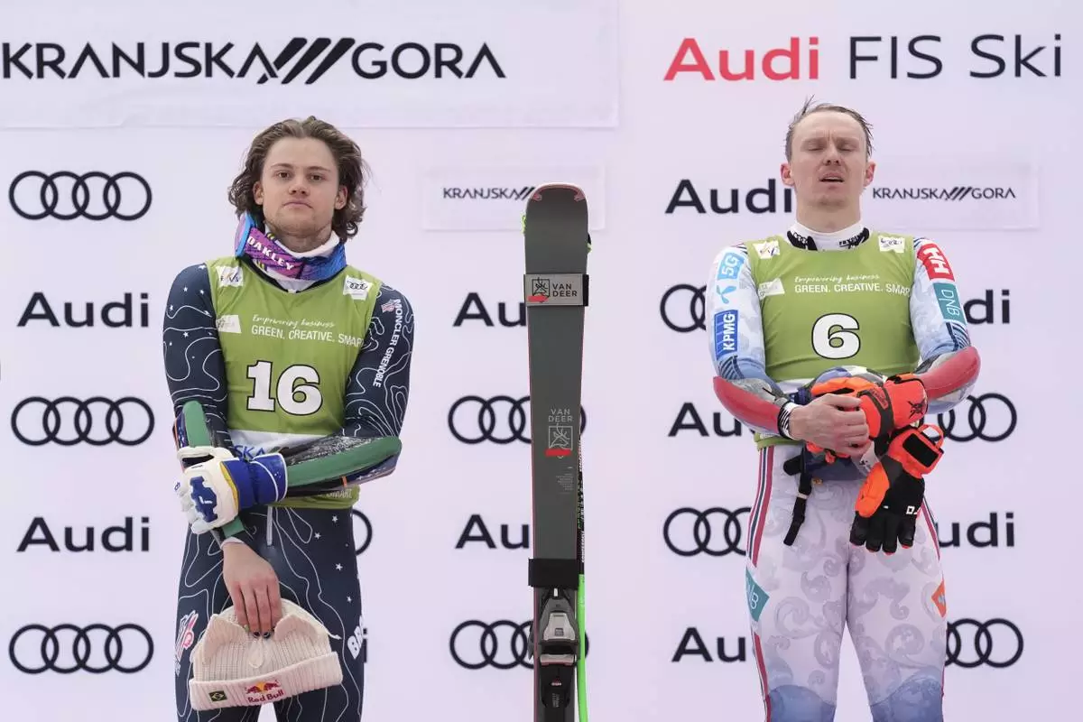 Norway's Henrik Kristoffersen, winner of an alpine ski, men's World Cup giant slalom, listens to the national anthem, next to second-placed Brazil's Lucas Pinheiro Braathen, left, in Kranjska Gora, Slovenia, Saturday, March 1, 2025. (AP Photo/Giovanni Auletta)