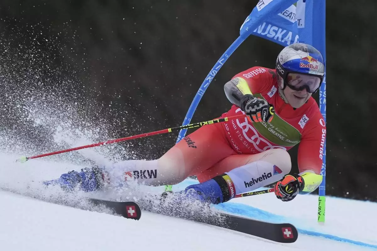 Switzerland's Marco Odermatt competes in an alpine ski, men's World Cup giant slalom, in Kranjska Gora, Slovenia, Saturday, March 1, 2025. (AP Photo/Giovanni Auletta)