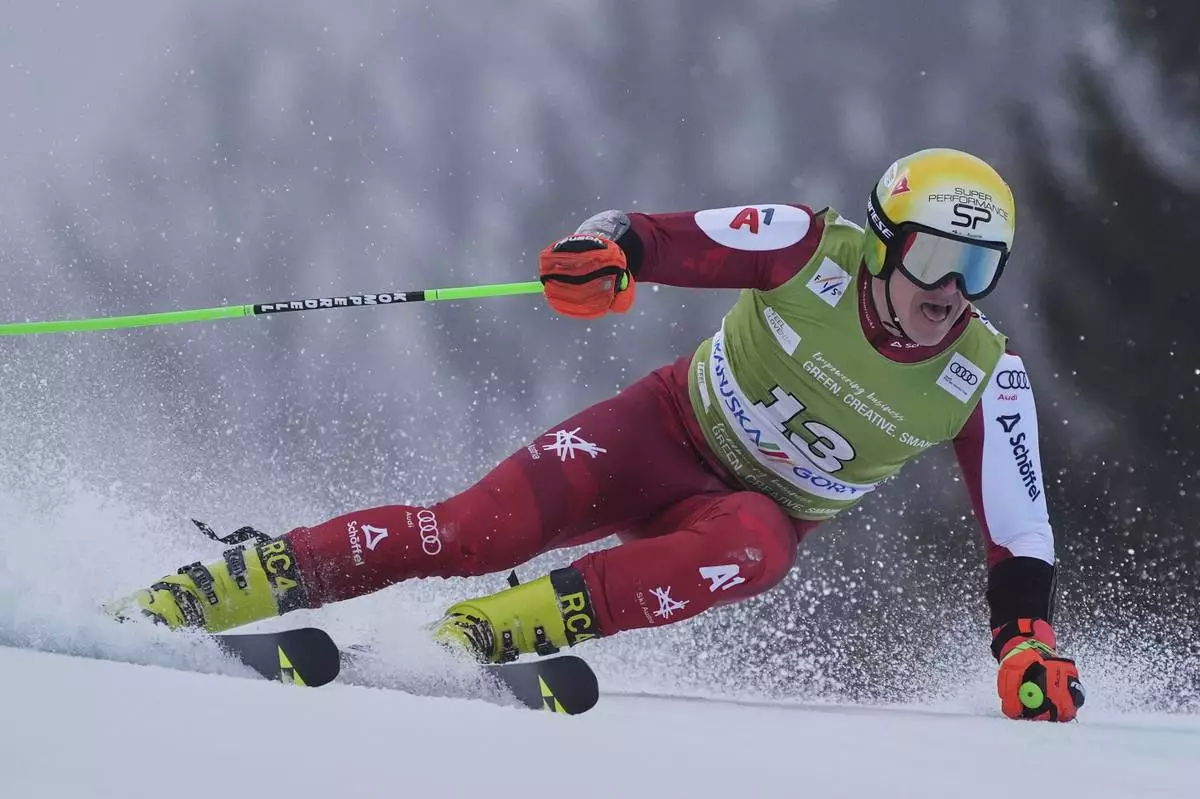 Austria's Raphael Haaser competes in an alpine ski, men's World Cup giant slalom, in Kranjska Gora, Slovenia, Saturday, March 1, 2025. (AP Photo/Giovanni Auletta)
