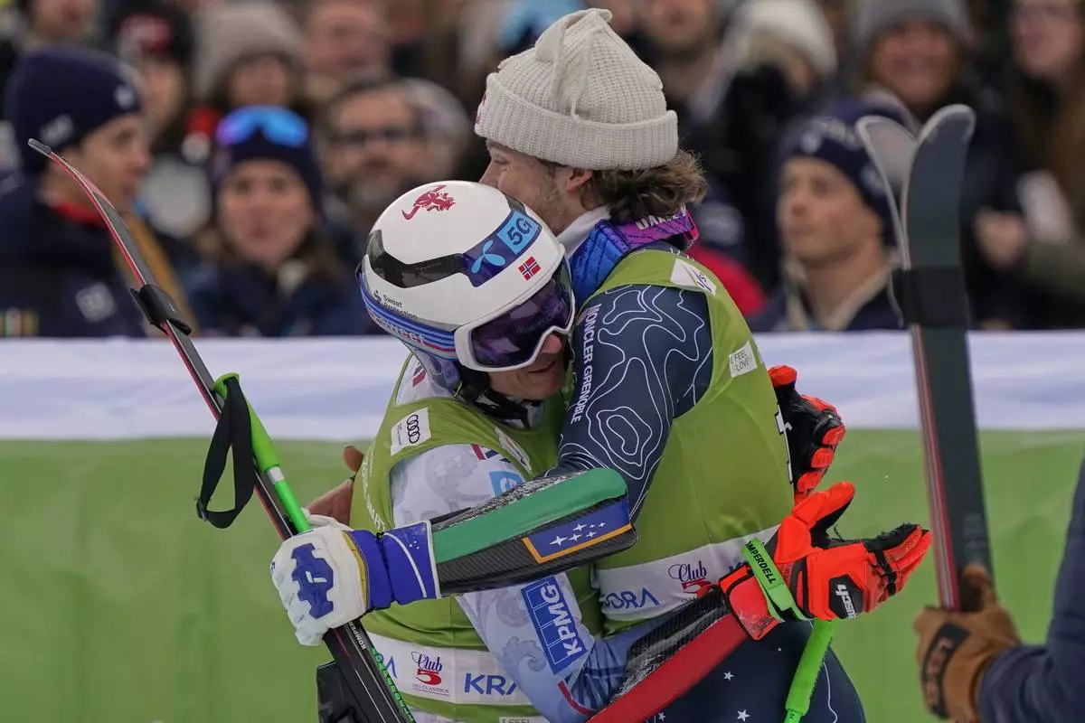 Norway's Henrik Kristoffersen, left, winner of an alpine ski, men's World Cup giant slalom, hugs second-placed Brazil's Lucas Pinheiro Braathen, in Kranjska Gora, Slovenia, Saturday, March 1, 2025. (AP Photo/Pier Marco Tacca)