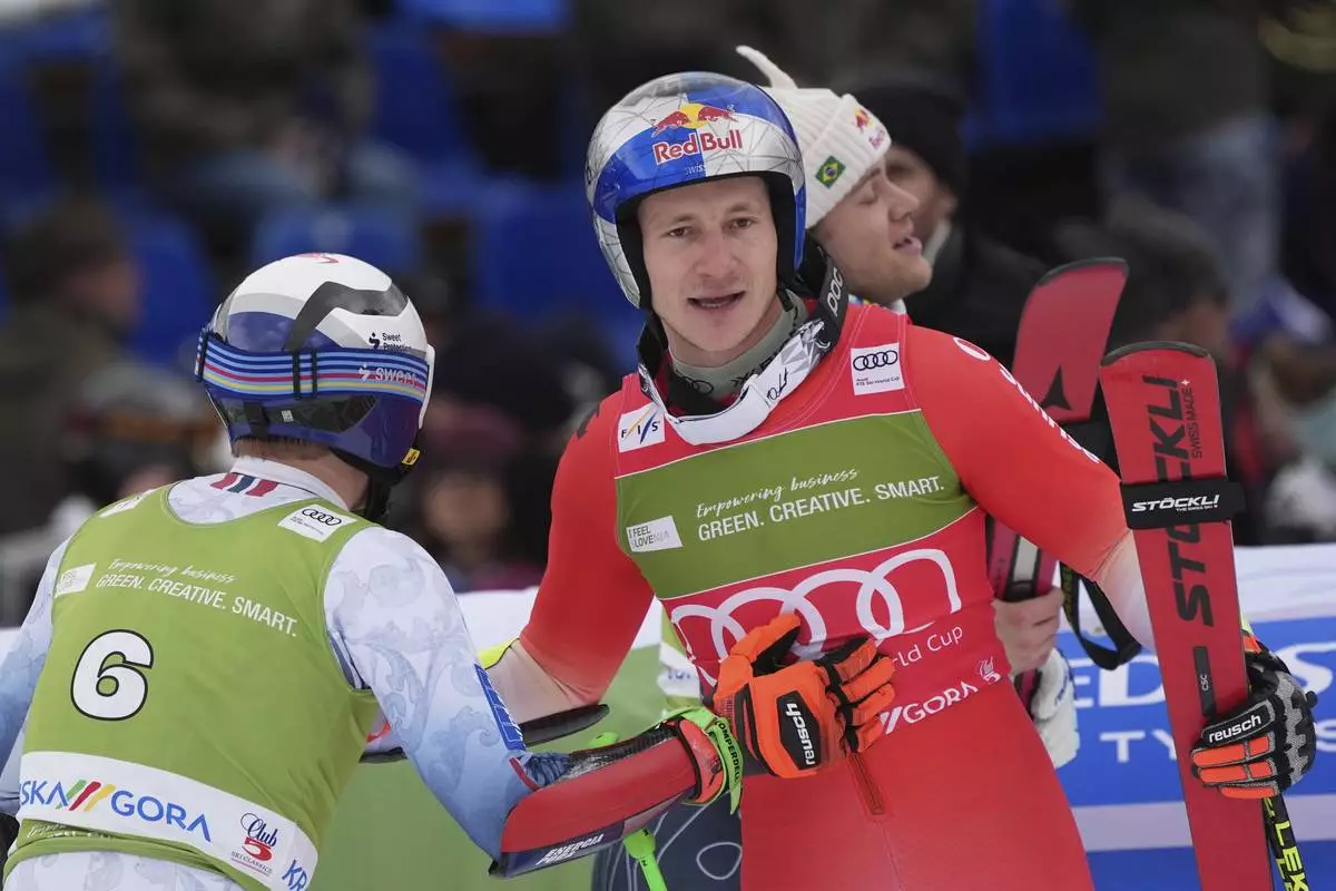 Norway's Henrik Kristoffersen, winner of an an alpine ski, men's World Cup giant slalom, and third-placed Switzerland's Marco Odermatt congratulate each other at the finish area, in Kranjska Gora, Slovenia, Saturday, March 1, 2025. (AP Photo/Giovanni Auletta)