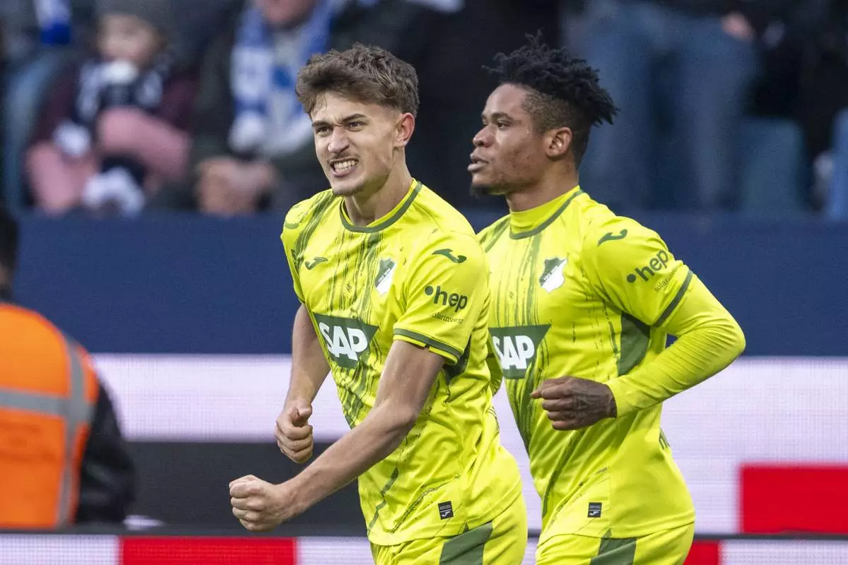 Hoffenheim's Tom Bischof, front, celebrates after scoring the opening goal during the German Bundesliga soccer match between VfL Bochum and TSG 1899 Hoffenheim in Bochum, Germany, Saturday, March 1, 2025. (David Inderlied/dpa via AP)