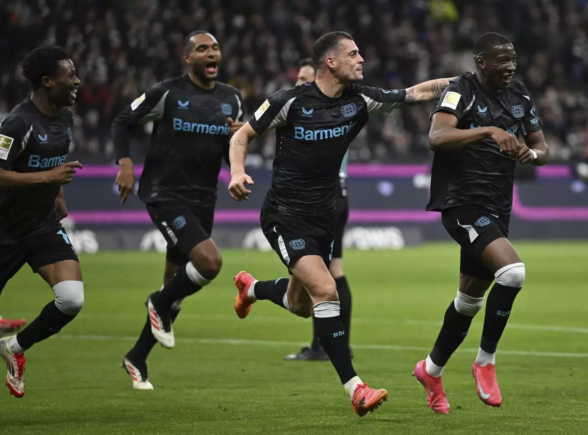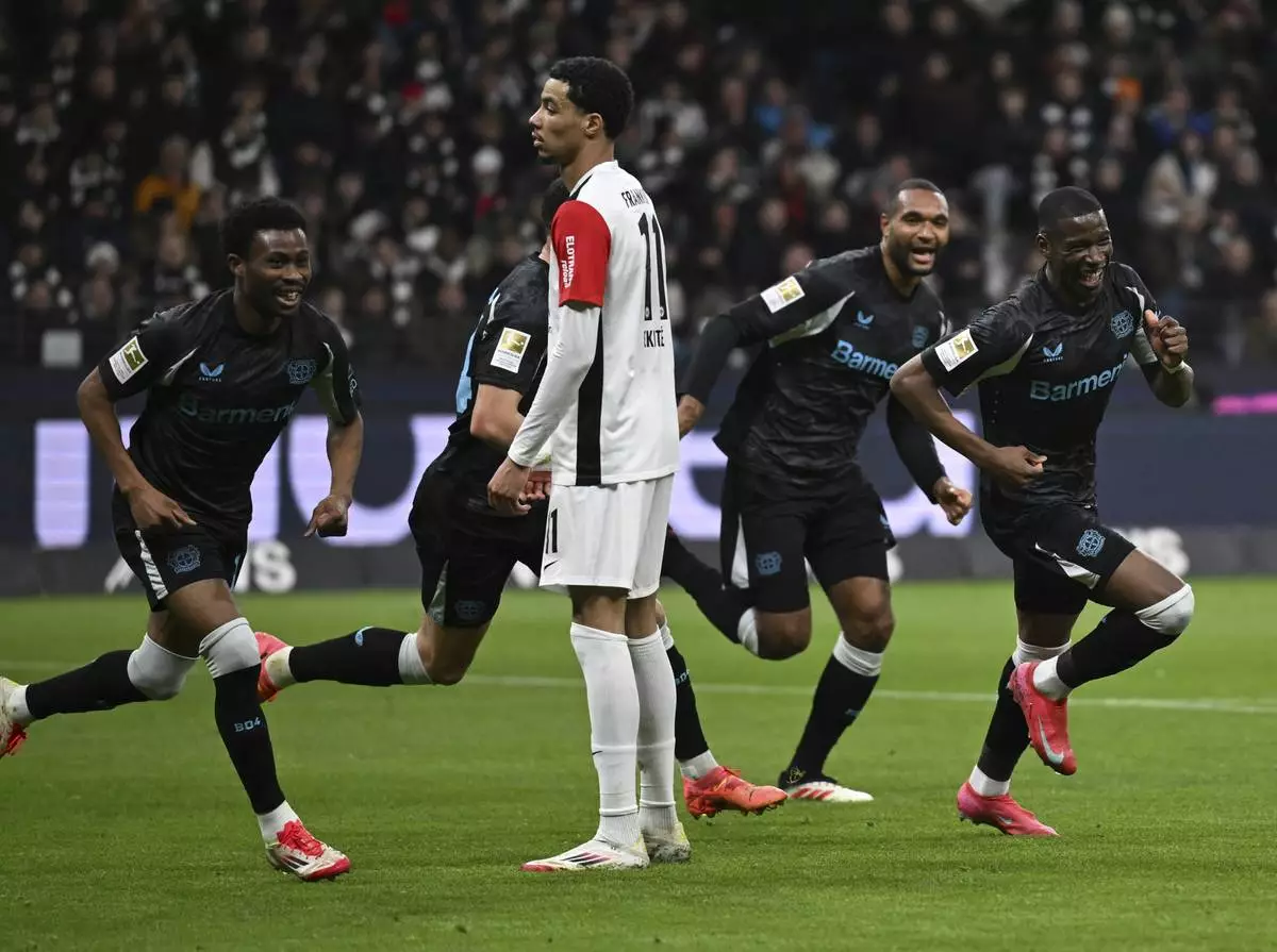 Leverkusen's scorer Nordi Mukiele, right, and his teammates celebrate their side's second goal during the German Bundesliga soccer match between Eintracht Frankfurt and Bayer Leverkusen in Frankfurt, Germany, Saturday, March 1, 2025. (Arne Dedert/dpa via AP)