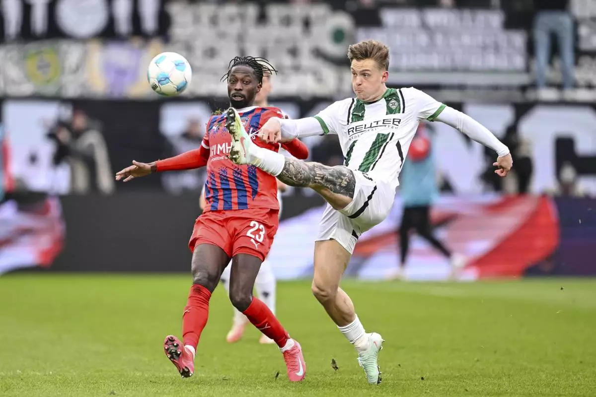 Heidenheim's Omar Traore, left, and Moenchengladbach's Luca Netz, right, challenge for the ball during the German Bundesliga soccer match between 1. FC Heidenheim and Borussia Moenchengladbach in Heidenheim, Germany, Saturday, March 1, 2025. (Harry Langer/dpa via AP)