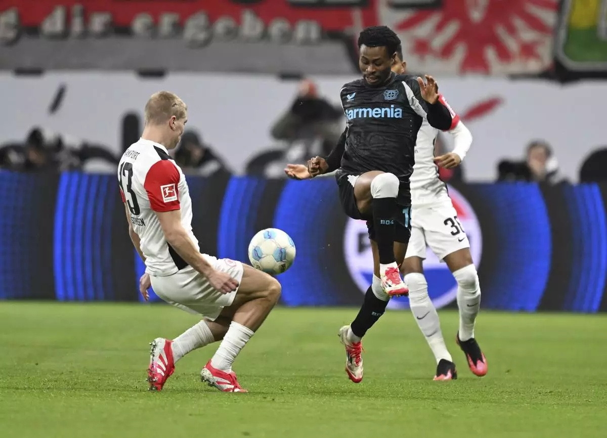 Frankfurt's Rasmus Kristensen, left, and Leverkusen's Nathan Tella, right, challenge for the ball during the German Bundesliga soccer match between Eintracht Frankfurt and Bayer Leverkusen in Frankfurt, Germany, Saturday, March 1, 2025. (Arne Dedert/dpa via AP)