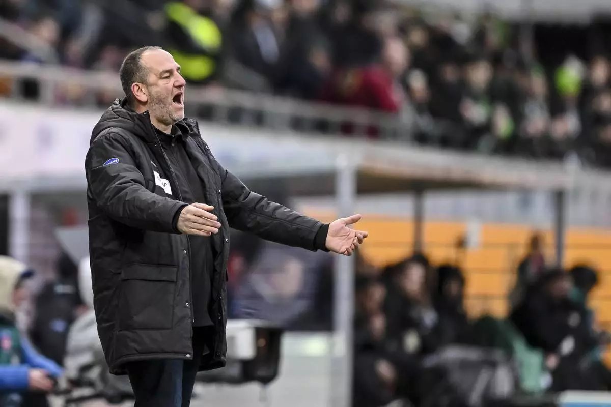 Heidenheim's head coach Frank Schmidt gestures during the German Bundesliga soccer match between 1. FC Heidenheim and Borussia Moenchengladbach in Heidenheim, Germany, Saturday, March 1, 2025. (Harry Langer/dpa via AP)