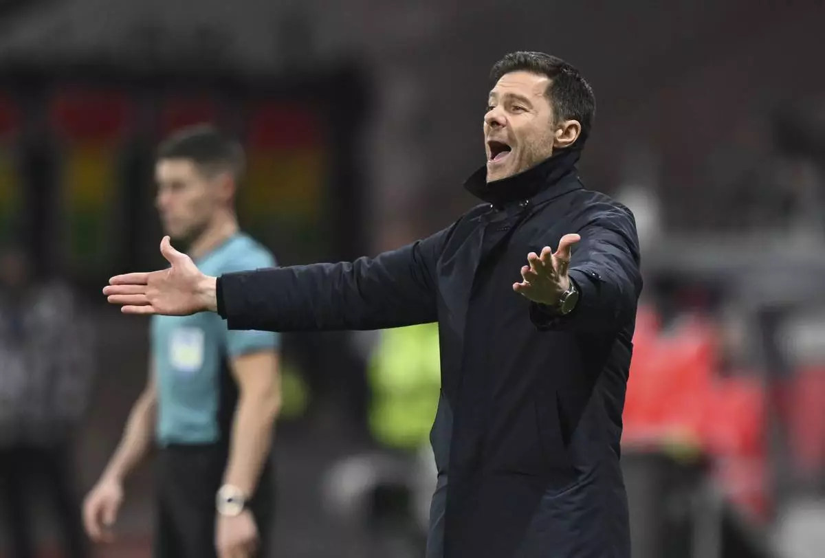Leverkusen's head head coach Xabi Alonso reacts during the German Bundesliga soccer match between Eintracht Frankfurt and Bayer Leverkusen in Frankfurt, Germany, Saturday, March 1, 2025. (Arne Dedert/dpa via AP)
