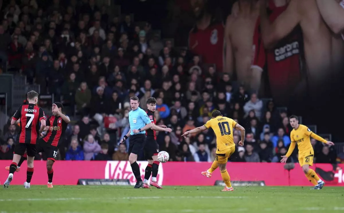 Wolverhampton Wanderers' Matheus Cunha scores his side's first goal during the FA Cup fifth round match between Bournemouth and Wolverhampton Wanderers, at the Vitality Stadium, Bournemouth, England, Saturday March 1, 2025. (Adam Davy/PA via AP)