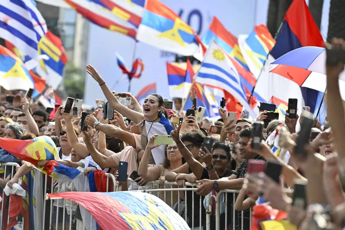 People greet Uruguay's newly sworn-in President Yamandu Orsi and Vice President Carolina Cosse as they ride by in an open car, on Inauguration Day in Montevideo, Uruguay, Saturday, March 1, 2025. (AP Photo/Santiago Mazzarovich)