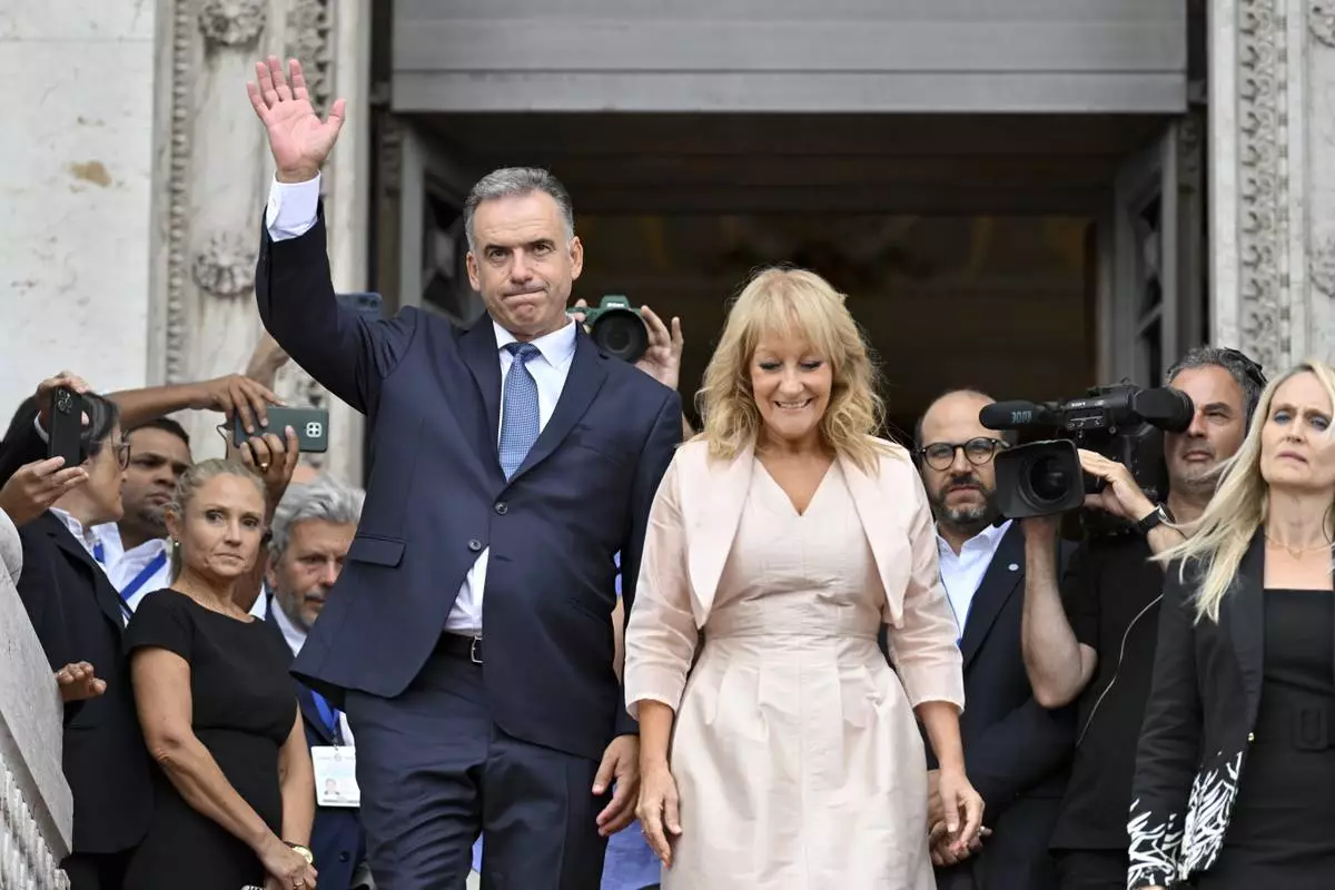 Uruguay's incoming President Yamandu Orsi and Vice President Carolina Cosse exit the Congress building after they attended their swearing ceremony, on Inauguration Day in Montevideo, Uruguay, Saturday, March 1, 2025. (AP Photo/Santiago Mazzarovich)