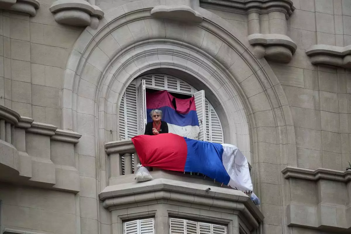 A woman stands on a balcony looking out at people gathering in Independent Square where President-elect Yamandu Orsi will receive the presidential sash, on Inauguration Day in Montevideo, Uruguay, Saturday, March 1, 2025. (AP Photo/Matilde Campodonico)