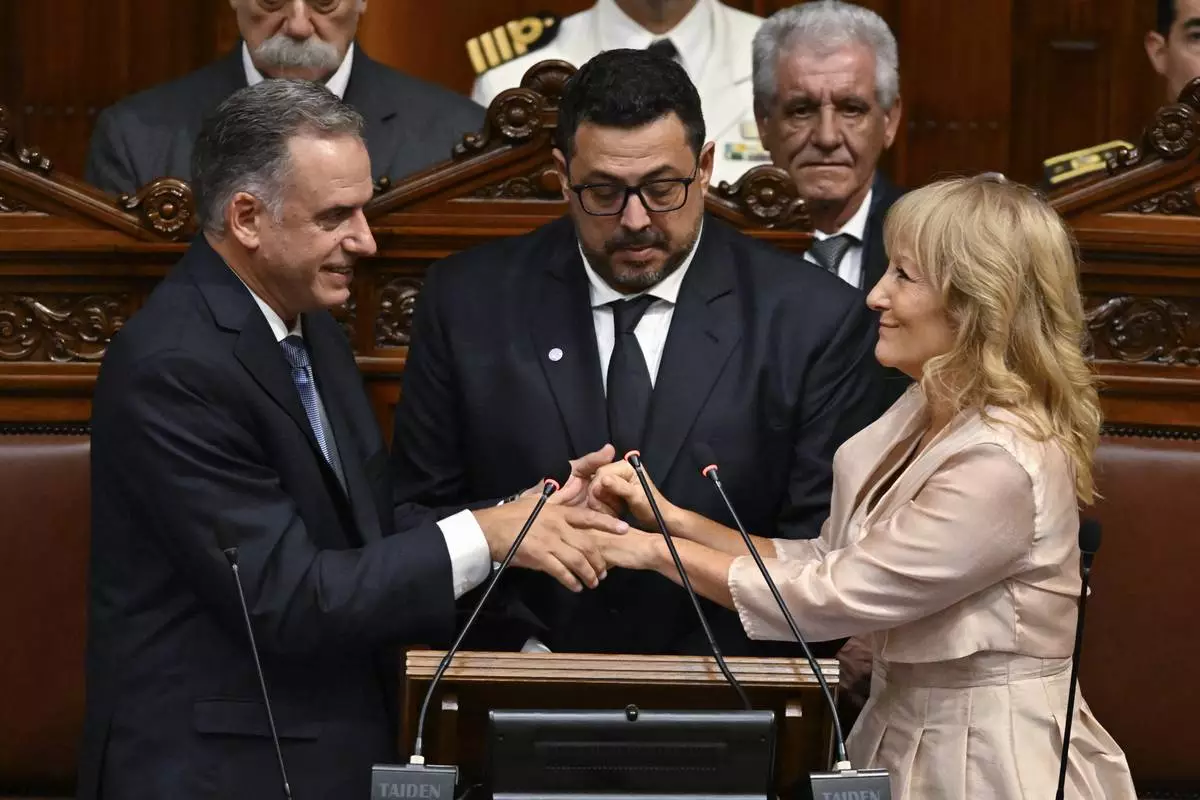 Uruguay's President-elect Yamandu Orsi holds hands with Vice President-elect Carolina Cosse, accompanied by Sen. Alejandro Sanchez, during their swearing-in ceremony in Congress on Inauguration Day, in Montevideo, Uruguay, Saturday, March 1, 2025. (AP Photo/Santiago Mazzarovich)