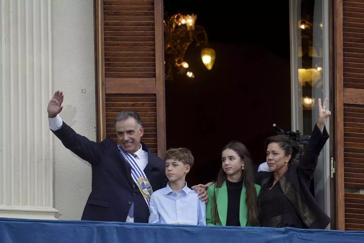 Uruguay's newly sworn-in President Yamandu Orsi and first lady Laura Alonso Perez wave from an Estevez Palace balcony, accompanied by their children, Victorio and Lucia, on Inauguration Day in Montevideo, Uruguay, Saturday, March 1, 2025. (AP Photo/Matilde Campodonico)