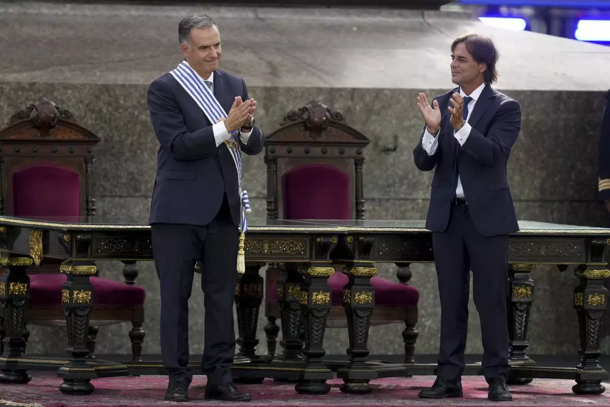 Uruguay's incoming President Yamandu Orsi, left, applauds after receiving the presidential sash from outgoing President Luis Lacalle Pou, on Inauguration Day in Montevideo, Uruguay, Saturday, March 1, 2025. (AP Photo/Matilde Campodonico)