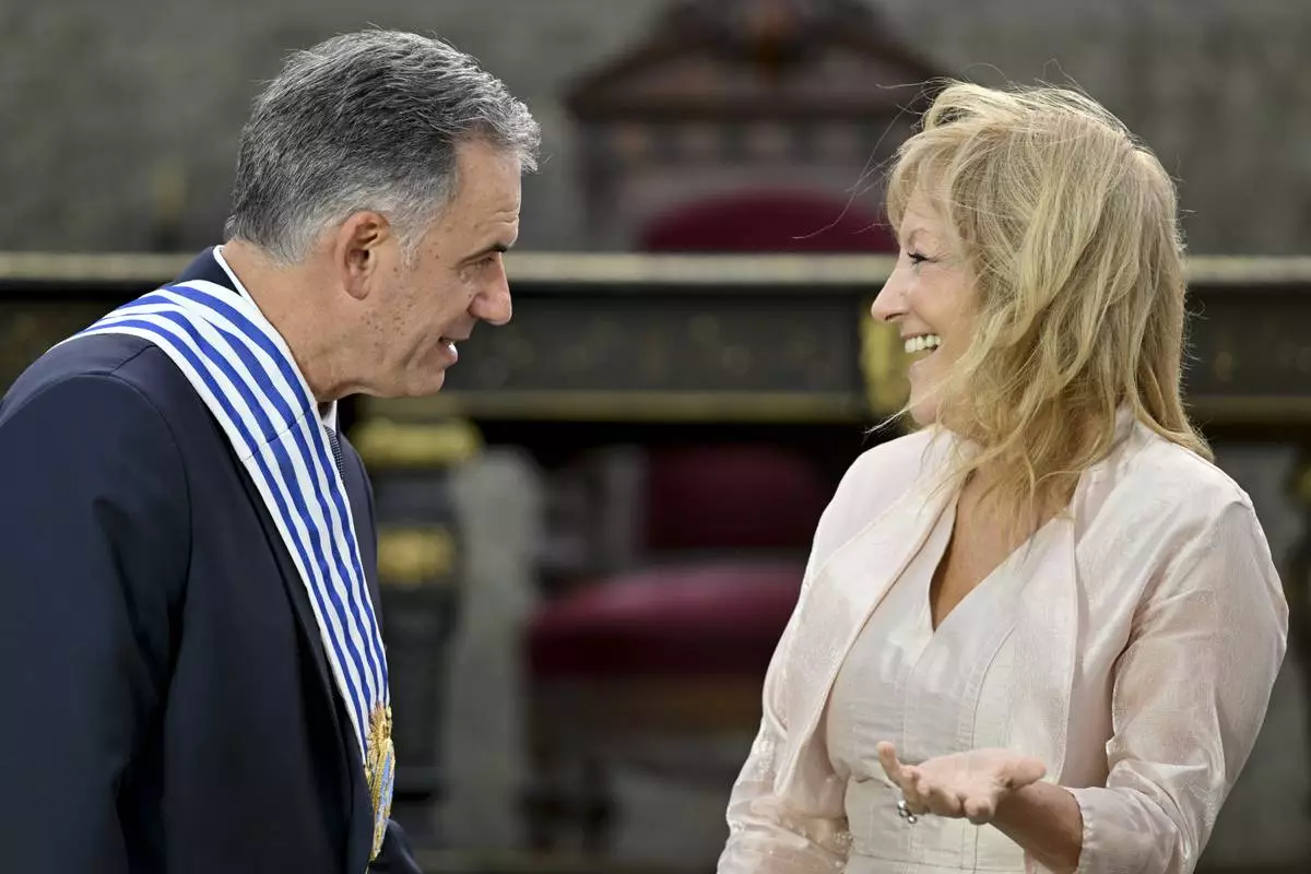 Uruguay's incoming President Yamandu Orsi and Vice President Carolina Cosse attend an Inauguration Day ceremony, in Montevideo, Uruguay, Saturday, March 1, 2025. (AP Photo/Matilde Campodonico)