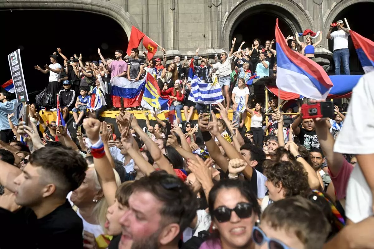 People gather with Uruguay's flags prior to President-elect Yamandu Orsi's swearing-in ceremony, on Inauguration Day in Montevideo, Uruguay, Saturday, March 1, 2025. (AP Photo/Matilde Campodonico)