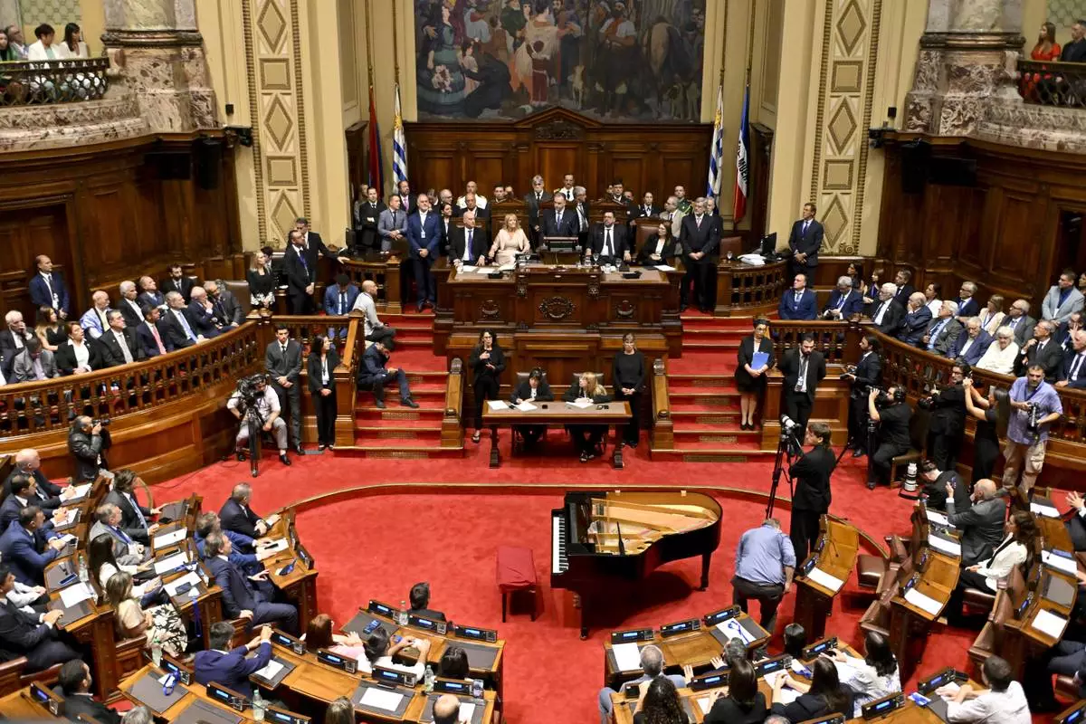 Uruguay's newly sworn-in President Yamandu Orsi, center back at podium, addresses Congress on Inauguration Day, in Montevideo, Uruguay, Saturday, March 1, 2025. (AP Photo/Santiago Mazzarovich)