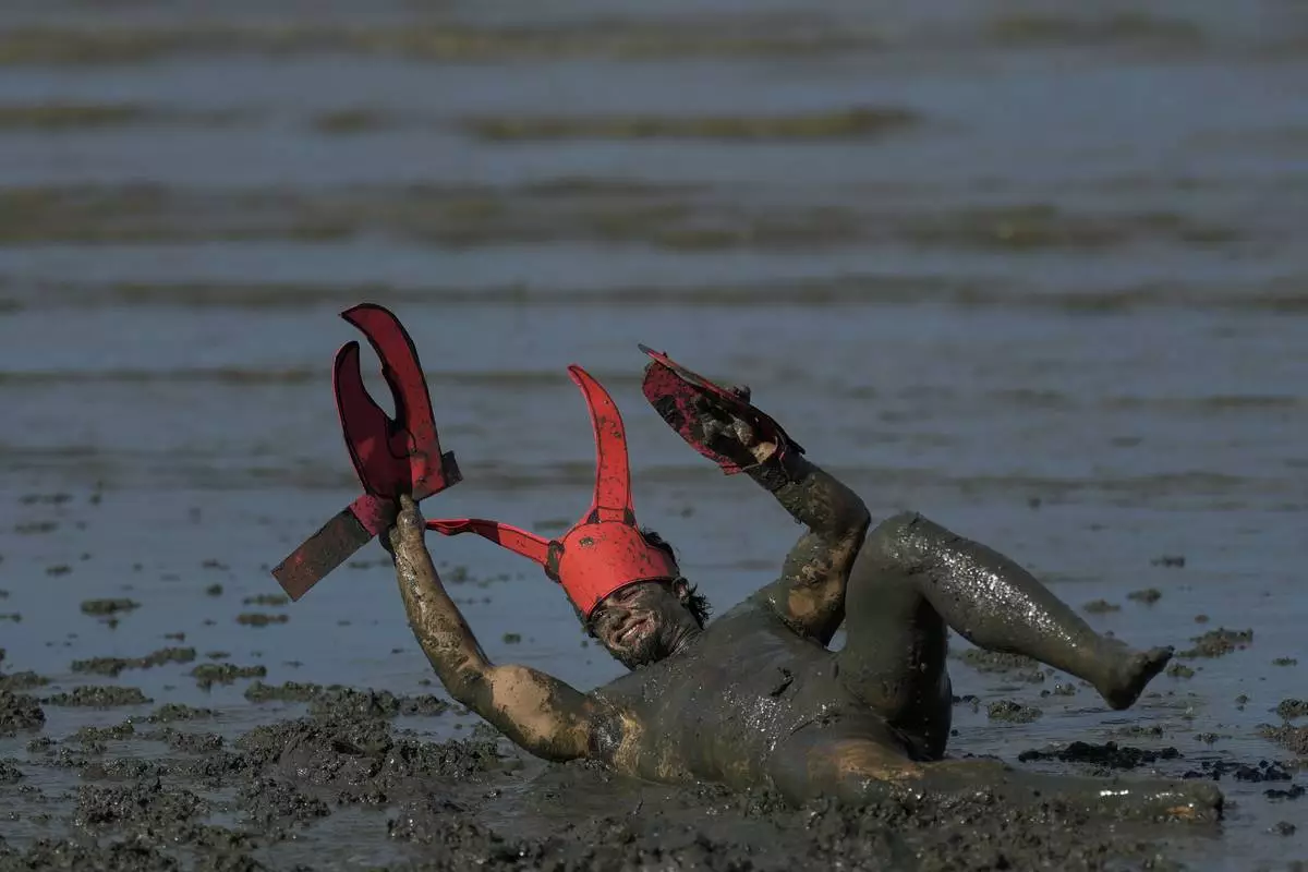 A reveler rolls in the mud during the traditional Mud Block carnival party in Paraty, Brazil, Saturday, March 1, 2025. (AP Photo/Andre Penner)