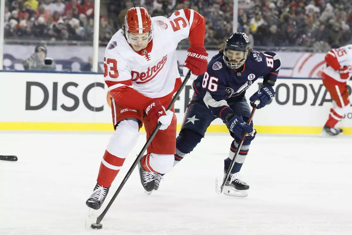 Detroit Red Wings' Albert Johansson, left, and Columbus Blue Jackets' Mikael Pyyhtia chase the puck during the second period of the Stadium Series NHL hockey game at Ohio Stadium, Saturday, March 1, 2025, in Columbus, Ohio. (AP Photo/Jay LaPrete)