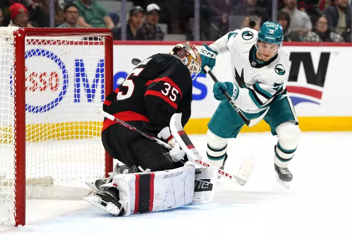 Ottawa Senators goaltender Linus Ullmark (35) makes a save on San Jose Sharks' Luke Kunin (11) during first period NHL hockey action in Ottawa, on Saturday, March 1, 2025. (Justin Tang/The Canadian Press via AP)