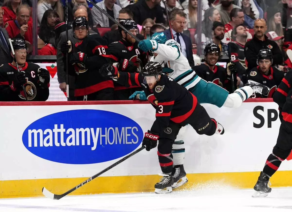 San Jose Sharks' Ty Dellandrea (53) crashes into Ottawa Senators' Nick Jensen (3) along the bench during first period NHL hockey action in Ottawa, on Saturday, March 1, 2025. (Justin Tang/The Canadian Press via AP)